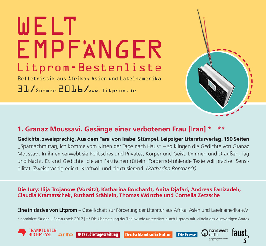 "Ein schöner wie überraschender Lyrikband bietet Verse von Granaz Moussavi. Die Iranerin lebt im australischen Exil, ist aber ihrer Heimat so eng verbunden, dass sie das Exil nicht einmal thematisiert. Die Auswahl umfasst Gedichte der letzten 20 Jahre aus drei verschiedenen Büchern, deren letztes in Iran nicht hat erscheinen können. Es enthält allzu provozierende Aussagen, sowohl in moralischer als auch in politischer Hinsicht..."
